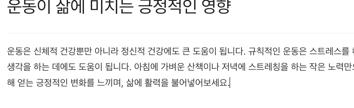운동이 삶에 미치는 긍정적인 영향 운동은 신체적 건강뿐만 아니라 정신적 건강에도 큰 도움이 됩니다. 규칙적인 운동은 스트레스를 해소하고 에너지를 증가시키며, 긍정적인 생각을 하는 데에도 도움이 됩니다. 아침에 가벼운 산책이나 저녁에 스트레칭을 하는 작은 노력만으로도 건강을 지킬 수 있습니다. 운동을 통해 얻는 긍정적인 변화를 느끼며, 삶에 활력을 불어넣어보세요. 카테고리 없음 2024.10.28